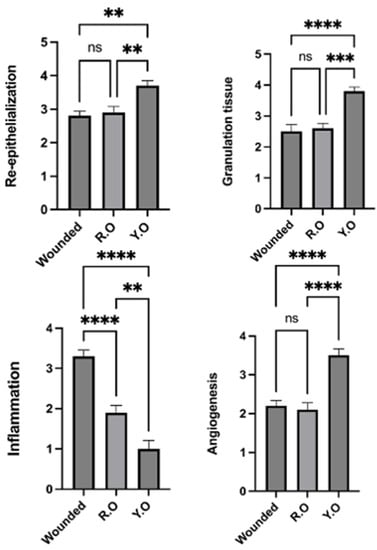 As illustrated in Figure 7, significantly better re-epithelization was noticed in the YO-treated group when compared to the RO-treated group. In comparison to other groups, the YO-treated group exhibited significantly improved collagen. Both treatments significantly reduced the degree of inflammation in the wound area. Angiogenesis was significantly higher in the YO-treated group.