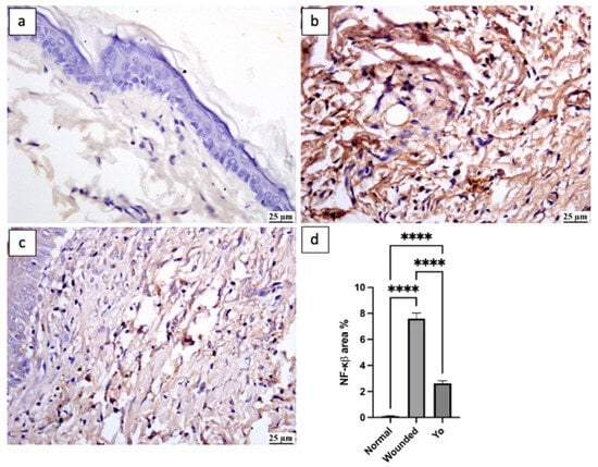 Photomicrograph of skin, immune expression of NF-κβ (immune staining). (a) Normal group showing limited NF-κβ expression; (b) wounded group showing intense NF-κβ expression; (c) YO-treated group showing moderate NF-κβ expression; (d) chart representing NF-κβ expression. Data are presented as mean ± SEM. Significance is considered at p < 0.05. The quantity of asterisks (*) denotes the degree of significance; (****): p < 0.0001; ns: no significance.