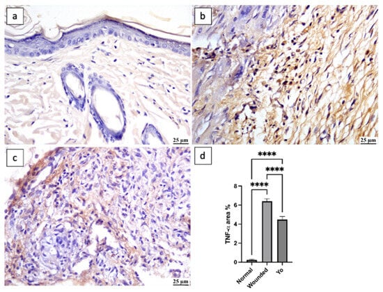 Photomicrograph of skin, immune expression of TNF-α (immune staining). (a) Normal group showing weak TNF-α expression; (b) wounded group showing increased TNF-α expression; (c) YO-treated group showing moderate TNF-α expression; (d) chart representing TNF-α expression. Data are presented as mean ± SEM. Significance is considered at p < 0.05. The quantity of asterisks (*) denotes the degree of significance; (****): p < 0.0001; ns: no significance.