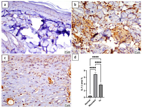 Photomicrograph of skin, immune expression of IL-1β (immune staining). (a) Normal group showing weak IL-1β expression; (b) wounded group showing intense IL-1β expression; (c) YO-treated group showing moderate IL-1β expression; (d) chart representing IL-1β expression. Data are presented as mean ± SEM. Significance is considered at p < 0.05. The quantity of asterisks (*) denotes the degree of significance; (****): p < 0.0001; ns: no significance.
