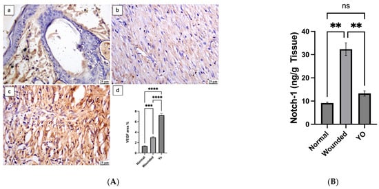(A): Photomicrograph of skin, immune expression of VEGF (immune staining). (a) Normal group showing mild VEGF expression; (b) wounded group showing moderate VEGF expression; (c) YO-treated group showing intense VEGF expression; (d) chart representing VEGF expression. (B): Notch-1 levels (ng/g tissue) in normal, wounded, and YO-treated groups. Data are presented as mean ± SEM. Significance is considered at p < 0.05. The quantity of asterisks (*) denotes the degree of significance; (**): p < 0.01, (***): p < 0.001, (****): p < 0.0001; ns: no significance.