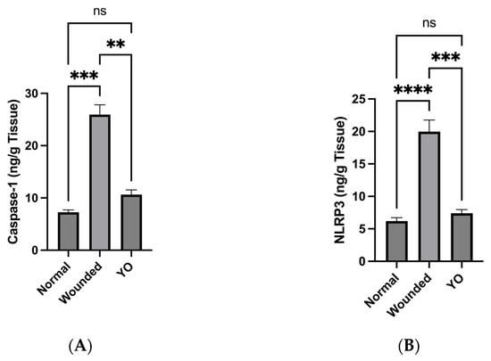 (A): Caspase-1 level (ng/g tissue) in normal, wounded, and YO-treated groups. (B): NLRP3 level (ng/g tissue) in normal, wounded, and YO-treated groups. Data are presented as mean ± SEM. Significance is considered at p < 0.05. The quantity of asterisks (*) denotes the degree of significance; (**): p < 0.01, (***): p < 0.001, (****): p < 0.0001; ns: no significance.