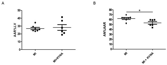 In order to confirm the results obtained in vitro, KYNA or NaOH was injected into male Wistar rats 10 min before a myocardial ischemia/reperfusion. Both the MI and MI + KYNA groups were subjected to 40 min of myocardial ischemia, followed by 2 h of reperfusion. Infarct size was significantly lower in animals receiving KYNA as compared to those receiving the vehicle only (AN%AAR = 53.3 ± 3% in MI + KYNA vs. 62.2 ± 2% in MI, p = 0.023), whereas the AAR%LV was similar in the two groups (Figure 2).