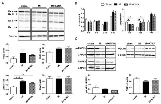 As shown in Figure 3A, complex III proteins’ expression was increased in the MI group compared to the sham (0.28 ± 0.02 in MI vs. 0.16 ± 0.02 in sham for complex III, p < 0.001). To ensure consistent mitochondrial content between groups, we assessed the CS activity in the same hearts used for the complex activity studies. The CS specific activity did not differ among the sham, MI, and MI + KYNA groups. Next, we evaluated the specific activities of complexes I, II, III, and IV, normalized to the CS activity. Despite no significant differences among sham, MI, and MI + KYNA groups in each complex’s specific activity, the equilibrium between respiratory complexes (complex ratio) (Figure 3B, right panel) was significantly decreased for complex ratio I/II in the MI and MI + KYNA groups compared to sham group (1.21 ± 0.07 in sham vs. 0.92 ± 0.06 in MI, p = 0.02 and vs. 0.88 ± 0.06 in MI + KYNA, p = 0.009) and significantly increased for complex ratio III/I in the MI and MI + KYNA groups compared to sham group (0.55 ± 0.04 in sham vs. 1.13 ± 0.17 in MI, p = 0.002 and 1.24 ± 0.32 in MI + KYNA, p = 0.25). The AMPKα’s, a metabolic sensor regulating PGC1α’s activity, phosphorylation levels were not significantly different among the groups. PGC1α protein expression, a transcription factor mediating mitochondrial biogenesis and oxidative phosphorylation, was not different among the sham, MI, and MI + KYNA groups (Figure 3C).