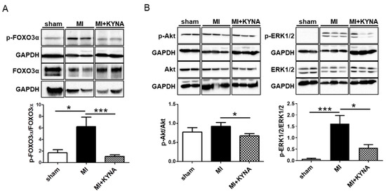 Foxo3α, Akt and ERK1/2 phosphorylation levels by means of Western blot. (A) Representative immunoblots and histogram quantification of protein expression levels for p-FOXO3α, FOXO3α and (B) p-ERK1/2, ERK1/2, p-Akt, Akt, in non-ischemic (sham), ischemic + vehicle (MI), and ischemic + kynurenic acid (MI + KYNA) left ventricle samples following 15 min of reperfusion (n = 6–9). GAPDH was used as the loading control. Data are expressed as mean ± SEM. * p < 0.05, *** p < 0.001.