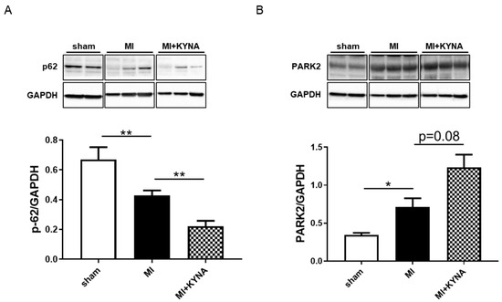 We assessed whether KYNA was capable of stimulating mitophagy as a cardioprotective mechanism. P62 protein levels were significantly decreased following myocardial ischemia/reperfusion compared to the sham intervention (0.67 ± 0.08 in the MI vs. 0.43 ± 0.03 in the sham, p = 0.004), decreasing even further following KYNA treatment (0.22 ± 0.04 in MI + KYNA vs. MI, p = 0.008). In addition, PARK2 protein levels were significantly increased in the MI group compared to the sham group (0.34 ± 0.03 in sham vs. 0.71 ± 0.11 in MI, p = 0.036). The KYNA treatment tended to increase PARK2 protein levels compared to the MI (1.23 ± 0.17 in MI + KYNA, p = 0.08) (Figure 6).