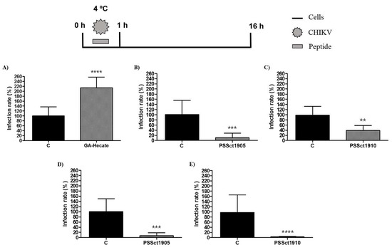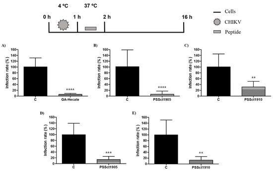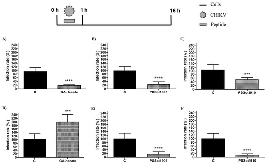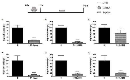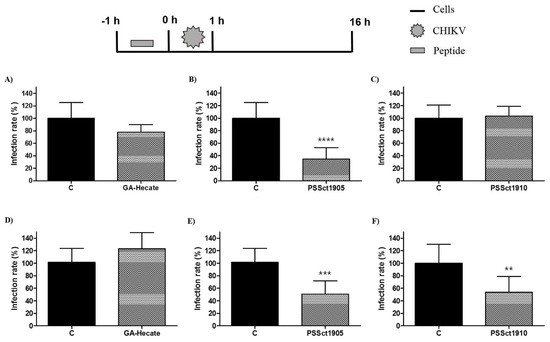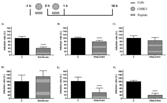 To investigate the ability of peptides GA-Hecate, PSSct1905, and PSSct1910 to inactivate extracellular CHIKV virions, the virus particles were treated with the peptides at the MNTC for 1 h and used for infection of BHK-21 and Huh-7 cells. In this assay, the peptides GA-Hecate and PSSct1905 reduced infection in BHK-21 cells, showing inhibitory effects of 59.4% (p ≤ 0.0001) and 21.4% (p ≤ 0.0001), respectively (Figure 4A,B). In Huh-7 cells, GA-Hecate did not inhibit viral infection (Figure 4D), while treatment with PSSct1905 resulted in 68% (p ≤ 0.0001) inhibition (Figure 4E). The peptide PSSct1910, on the other hand, only presented virucidal activity when treated virions were used to infect Huh-7 cells (80.2% inhibition; p ≤ 0.0001) (Figure 4F).