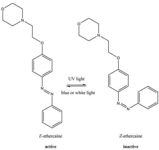 Previously, we obtained a photoswitchable local anesthetic, ethercaine, and demonstrated the possibility of reversible light-controlled anesthesia in vivo using this compound [19]. When ethercaine solution was irradiated with blue or white light, local anesthetic properties of the compound appeared; however, after irradiation with UV light (365 or 395 nm), the biological activity disappeared almost completely (Figure 1).