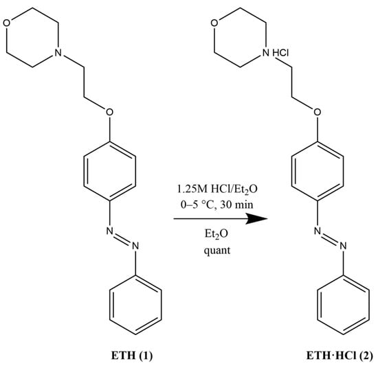 The majority of local anesthetics (LA) contain a tertiary nitrogen atom in the structure, which is necessary for the manifestation of biological activity. The most common dosage form of LA are aqueous solutions of their salts, mainly hydrochlorides. This form was also chosen to study the solubilization of ethercaine. One of the common methods for preparing amine hydrochlorides is their treatment with HCl solution in organic solvents. One such solvent may be diethyl ether [34]. A method for the preparation of ethercaine hydrochloride (ETH·HCl) using HCl/Et2O, which is also suitable for its derivatives, was developed and optimized (Figure 3).