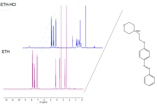 1H NMR spectroscopy showed that a signal from an additional proton in ETH·HCl relative to the free amine in ETH appeared, and the chemical shifts of the protons of the morpholine ring and the ethoxy linker changed (Figure 4).