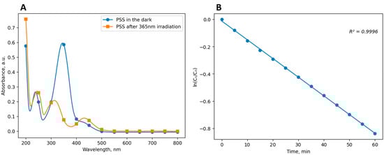 UV/Vis spectroscopy was used for the time determination of Z-isomers’ half-lifes. Solutions were kept in the dark at room temperature before the experiment. First, the spectrum for was registered, which corresponded to the PSS with E-isomer prevalence. Then, the solution was irradiated with UV light (λ = 365 nm) for 5 min to give the PSS with Z-isomer prevalence. The spectrum for was registered. After that, back Z-E isomerization was observed at for 60 min in increments of 5 min. Then, values were calculated using Equation (1):