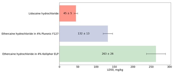 It was found that a solution of ethercaine hydrochloride based on 4% Kolliphor ELP is two-times less toxic when administered intravenously than a similar solution in 4% Pluronic F127 (LD50 was 263 ± 26 mg/kg and 132 ± 13 mg/kg, respectively). It is known that the intravenous administration of lipid emulsions can reduce or completely stop the manifestations of acute toxicity of local anesthetics [39,40]. This effect may explain the observed difference between the two solubilizers, since Kolliphor ELP is of a lipid nature, unlike Pluronic F127.