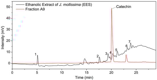 The methodology devised in HPLC–DAD to examine the EES extract allowed the separation of the extract’s main constituents. Fraction A9 was evaluated using this methodology, which separated two major compounds, one with a retention time of 20.06 min and the other with a retention time of 23 min (Figure 1), indicating a purity of approximately 80% for catechin (Table S1, Supplementary Materials). By comparing the retention time of the EES chromatograms and fraction A9, it was observed that catechin has the same retention time as the major compound number 4 identified in the EES. These results suggested that catechin is one of the key compounds present in the EES.