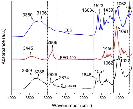 FTIR spectra of the raw materials used in making the gels—EES, PEG and CS.