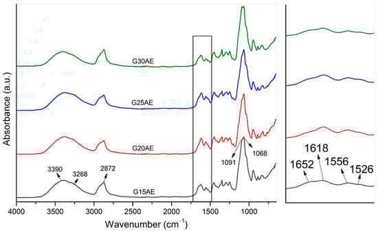 FTIR spectra of CS-PEG-EES gels prepared with acetic acid—G15AE; G20AE; G25AE; and G30AE (left) and spectra zoom in the range of 1670−1480 cm−1 (right).