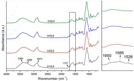 FTIR spectra of CS-PEG-EES gels prepared with lactic acid—G15LE; G20LE; G25LE; and G30LE (left) and spectra zoom in the range of 1670−1480 cm−1 (right).