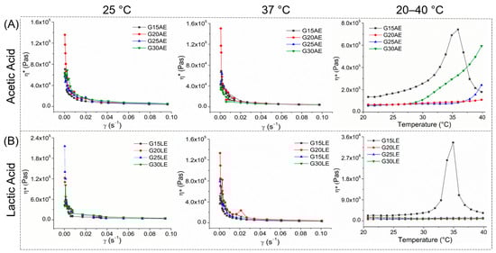 Viscosity curves (η*) vs. shear stress (γ) (0.001–0.1 (s−1)) at different temperatures (°C) (25, 37, and 20–40 °C) of the gels synthesized using (A) acetic acid, and (B) lactic acid.