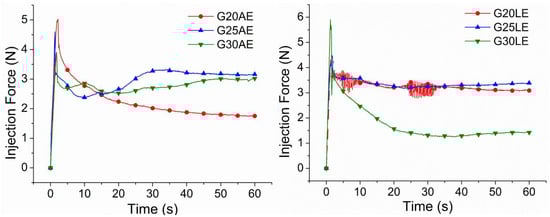 Gel formulations were examined for their simplicity of administration with a syringe. The representative compression force measurement as a function of gel injection time was observed and is shown in Figure 6. The initial sliding force (force required for the piston’s initial movement), dynamic sliding force (force required to maintain plunger movement), and maximum force (highest force observed during the experiment) needed to extrude the mixture were also measured and are listed in Table 3.