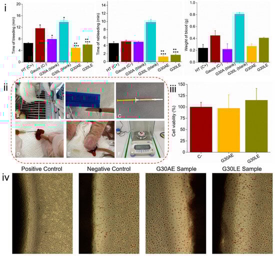 (i) Bleeding times, rebleeding times, and blood weight presented by the gels. Samples with (*) express a significant difference (p < 0.05) with the positive control Hemostank (HT); (**) with the Gaze negative control; and (***) with whites, according to the Kruskal-Wallis non-parametric test, followed by Dunn’s multiple comparisons tests. (ii) Images of the surgical procedure performed on the tails of Wistar rats. Demarcation of the surgical incision (A,B); Insulin syringe containing 1 mL of sample (C); Sample application at the incision site (D,E); Weighing the gauze to obtain the blood volume (F). (iii) Cytotoxicity of G30AE and G30LE gels by MTT assay. (iv) Photographs of the positive and negative controls, G30AE and G30LE compositions.