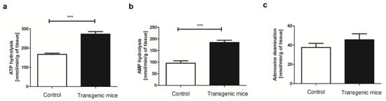 The ATP and AMP hydrolysis rates on the aortic surface of the transgenic mice were approximately two times higher in comparison with the control (Figure 1a,b), which was an expected effect due to the genetic modifications of these animals. There was no statistically significant change in the vascular adenosine deamination rate between both study groups (Figure 1c).