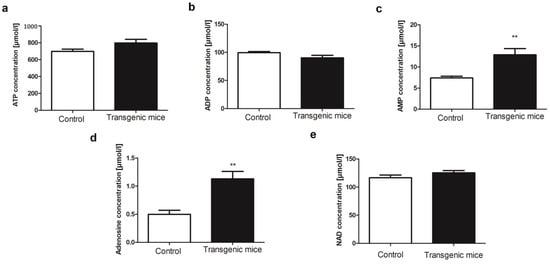 To assess the cell energy balance changes, the blood nucleotide concentration was measured (Figure 2). There were no significant changes in blood ATP, ADP, but also nicotinamide adenine dinucleotide (NAD) concentration in transgenic mice in comparison to the control (Figure 2a,b,e). However, we observed approximately two-fold increased concentration of AMP and adenosine in transgenic mice as compared to control (Figure 2c,d).