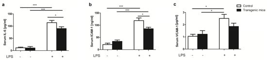 Considering that the activities of the three, used in this model, proteins have been reported to exert anti-inflammatory effects [,,], their potential role in protection against acute LPS-induced inflammation was investigated. The level of both adhesion molecules, associated with the endothelium activation—ICAM-1 and VCAM-1, as well as IL-6, were increased in both study groups of animals, regardless of their genotype as compared to non-treated animals. However, we observed a considerable decrease in IL-6, ICAM-1, and VCAM-1 in LPS-treated transgenic mice in comparison to LPS-treated controls (Figure 3).