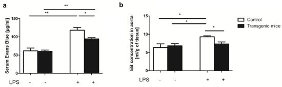 Furthermore, vascular endothelial function was assessed by Evans Blue (EB) permeability assay. The EB concentration was significantly increased in serum but also in the aortas of LPS-treated mice, both transgenic and controls, as compared to non-treated animals. Interestingly, LPS-treated transgenic mice were characterized by considerably lower EB concentration in serum and aortic tissue extract in comparison to LPS-treated controls (Figure 4).