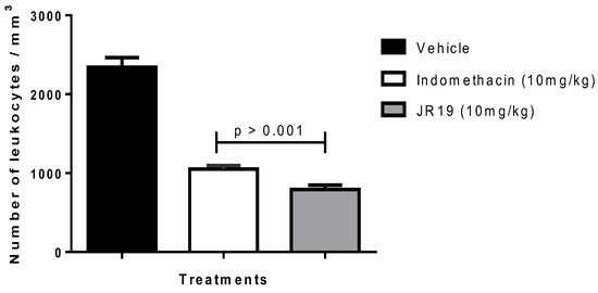 An injection of sterile air was used to create an air pouch in the back of the mice (group n = 6). On the 1st day, 2.5 mL of sterile air was injected, and the procedure was repeated after 72 h. On the 7th day, the mice received vehicle (saline, 10 mL/kg), indomethacin (10 mg/kg), and JR19 (10 mg/kg) orally. To induce inflammation, 1.0 mL of a 1% carrageenan solution was injected into the air pouch one hour after drug administration. Six hours after application of the phlogistic agent, the animals were euthanized, and the pouches were washed with 3.0 mL of PBS at pH 7.2, containing heparin as a carrier liquid. The total leukocyte count was performed in a Neubauer chamber under light microscopy [84,85].