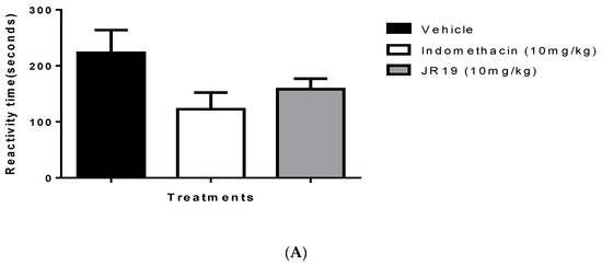 The mice (group n = 6) were treated orally with saline (10 mL/kg), indomethacin, and JR19 (10 mg/kg). After 60 min, 20 μL of 2.0% formalin solution was administered under the plantar pad of the right hind paw. The time in seconds that the animals exhibited painful signs with various behaviors was then timed: raising the paw, licking, biting, swinging the injected paw, and reducing the weight on the paw [86]. The reduction in these behaviors is interpreted as an antinociceptive effect. Based on the pattern of responses, it was possible to identify two phases: the first phase (in the first five minutes) and the second phase (fifteen to thirty minutes after injection), which are related to the neurogenic and inflammatory phases, respectively [87,88].