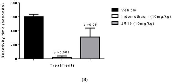 The formalin-induced nociception model was used as a starting point for the study of antinociceptive effects. This model allows the identification of drug candidates with analgesic effects dependent on anti-inflammatory action and involves two phases of nociceptive behavior that indicate the involvement of different chemical mediators. The first phase is characterized by profound neurogenic pain and involves chemical mediators such as P, glutamate, and bradykinin. The subsequent phase appears to result from changes in tissue and function within the dorsal horn of the spinal cord and involves agents such as histamine, serotonin, prostaglandins, and bradykinin. Crucially, the second phase does not occur due to the first one. There is a period of quiescence between the two phases in which no stimulus is manifested [20,21]. Oral administration of JR19 or indomethacin at a dose of 10 mg/kg did not affect this model’s first phase of nociception (neurogenic pain) (Figure 3A). In the second phase of nociception (inflammatory pain), both JR19 and the standard drug group, indomethacin, significantly reduced the animals’ response time to intraplantar formalin injection by 39% and 93%, respectively, compared to the vehicle group (Figure 3B).
