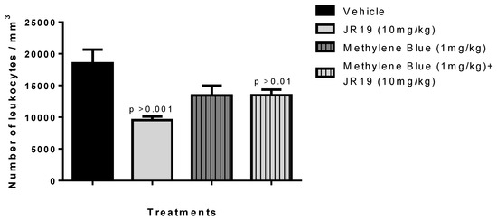 Influence of treatment with the compounds JR19 and Methylene Blue on the total leukocyte count in the model of peritonitis induced by carrageenan (1%). Values are expressed as mean ± standard deviation of the mean, n = 6. p > 0.01 or p > 0.001 significantly different from vehicle group (saline) (ANOVA followed by Dunnett’s test).