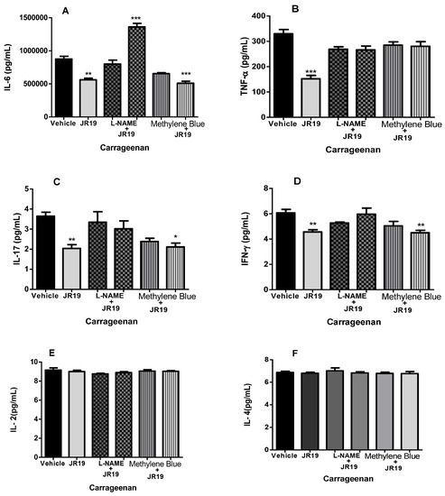(A–F). Effect of JR19 compound and pretreatment with L-NAME or methylene blue (i.p.) administered 30 min before JR19 compound (p.o.) on the concentrations of cytokines (IL-6, TNF-α, IL-17, IFN-γ, IL-2, and IL-4) in the peritoneal exudate of mice. Values are expressed as mean ± SD, and asterisks indicate statistically significant differences compared with the vehicle group (saline). *** p > 0.001, ** p > 0.01, * p > 0.05. Analysis of variance (ANOVA) followed by Bonferroni test.