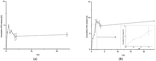 The release of 5-FU from coated nanoparticles proceeds with low efficiency for both HSA NPs-1@CM (Figure 2a) and HSA NPs-5@CM (Figure 2b). In addition, the release profile of the HSA NPs-5@CM sample can be divided into two stages—the first from 0 to 1.5 h, characterized by linearity, and the second, in which the establishment of an equilibrium state with large standard deviations can be observed. This phenomenon is related to an extra barrier to the drug being released.