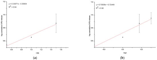 To determine the in vitro kinetics and the release mechanisms of 5-FU, the first-order model (Equation (1)) and Korsmeyer–Peppas model (Equation (2)) were used.