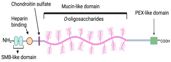 Schematic structure of full-length 1404 amino acid proteoglycan-4 (PRG4). PRG-4 contains a heavily glycosylated central mucin domain that imparts boundary-lubricating effects. PRG4’s N-terminus contains a somatostatin B-like (SMB) domain, heparin-binding site, and chondroitin sulfate. PRG4’s C-terminus contains a hemopexin-like domain. (Created with https://BioRender.com/).