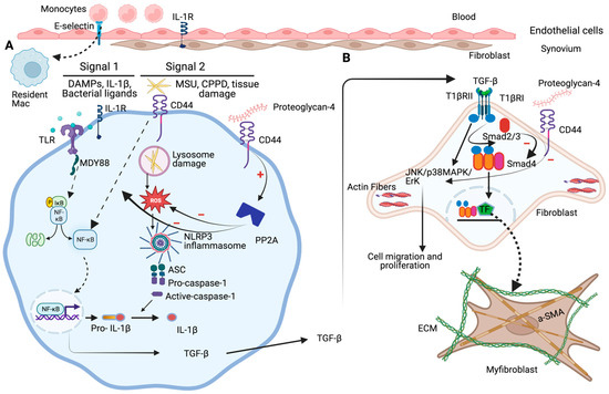 Role of the PRG4-CD44 axis in mitigating the pro-inflammatory and pro-fibrotic signaling pathways in DJDs. In response to injury, monocytes migrate into the synovial joint and differentiate into macrophages. Priming the resident macrophages by DAMPs, IL-1β, or bacterial ligands via TLRs or IL-1β receptor triggers signaling cascades that activate NFκB translocation, pro-IL-1β production, and NLRP3 inflammasome assembly, an innate cytosolic multiprotein complex that triggers IL-1β maturation. NFκB translocation induces transcription of proinflammatory cytokines, e.g., IL-1β and TNF-α, that drive the inflammatory response (Signal 1). Detection of endogenous danger signal, e.g., MSU crystals or extracellular matrix breakdown products by CD44 receptors (Signal 2), provokes ROS production, NLRP3 inflammasome assembly, and IL-1β secretion (A). Activated resident macrophages also produce profibrotic mediators, including TGF-β that directly activate resident fibroblasts and promote their differentiation into collagen-producing myofibroblasts that possess enhanced de novo α-SMA expression. TGF-β signaling pathway leads to Smad2/3 phosphorylation. The activated Smad2/3 form complexes with Smad4 and translocate to regulate downstream gene transcription. The TGF-β signaling pathway also activates the JNK/p38MAPK/Erk pathway, resulting in an increase in cell proliferation and migration (B). PGR4-CD44 interaction reduces endogenous danger internalization, DAMP-induced NF-κB nuclear translocation, IL-1β production, and NLRP3 inflammasome activation. The binding of PRG4 to CD44 receptor activates PP2A to inhibit ROS generation and NF-κB nuclear translocation. The PRG4-CD44 axis regulates synovial fibroblast to myofibroblast transition as exhibited by a reduction in Smad3 phosphorylation, α-SMA, collagen expression, fibroblast proliferation, and migration. (Created with https://BioRender.com/).