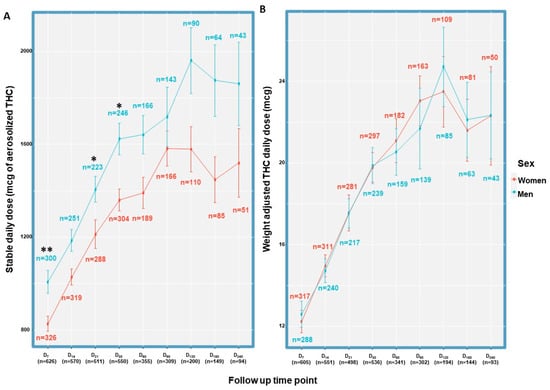 Sex comparison of Δ9-THC doses during MDI treatment. Unadjusted (A) and weight-adjusted (B) Δ9-THC doses in women and men. D, day; *, p < 0.05 and **, p < 0.01 in a two-sample Kolmogorov–Smirnov test between the sexes in the specific time point; Δ9-THC, ∆-9-tetrahydrocannabinol. Sample sizes are different between A and B due to missing data on weight; error bars represent standard deviation.