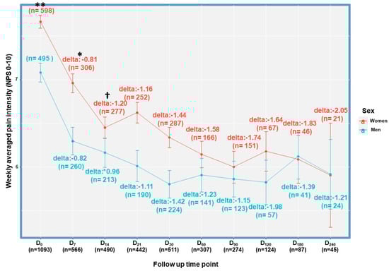 At D0 and in the first follow-up time point (D7), the average weekly pain intensity was statistically higher among women than men (χ2(1) = 0.11, p < 0.01 and χ2(1) = 0.14, p < 0.01, respectively). At the following time points, pain intensity was similar between the sexes (p > 0.05). The mean change in pain intensity from D0 was similar at most follow-up time points (p > 0.05), except for D14, when women exhibited superior reduction in pain intensity (−1.20 ± 1.60 NPS points) compared to men (−0.96 ± 1.90 NPS points) (χ2(1) = 0.13, p < 0.05) (Figure 3). The pain reduction response comparison data are presented in Results S1.