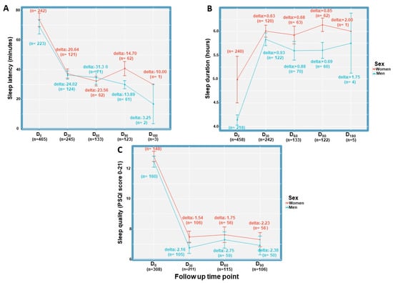 No sex-related differences were found in sleep parameters at all time points (p > 0.05). Overall, sleep latency improved (i.e., shortened), sleep duration improved (i.e., lengthened and sleep quality improved (Figure 4).