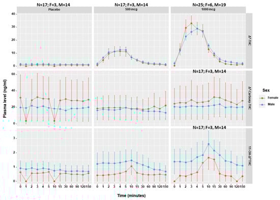 In the combined pharmacokinetic data, no sex-related differences were found in the blood levels of Δ9-THC and its metabolites, 11-hydroxy-Δ9-THC and Δ9-Carboxy-THC, at any of the time points (p > 0.05) (Figure 5). Nonetheless, we found that a higher dose of 1000 mcg Δ9-THC produced almost double the plasma levels of Δ9-THC following a 500 mcg Δ9-THC dose at Cmax. This was not the same for Δ9-THC metabolites (Δ9-Carboxy-THC and 11-OH-Δ9-THC) which were found to be relatively stable, regardless of the administered dose of Δ9-THC (Figure S1). Notably, Δ9-THC metabolites were also detected and displayed for the placebo arm as all patients were assessed following at least 12 h after their regular MC treatment. The individual patients’ pharmacokinetic responses, differentiated by sex, are displayed in Figure S2.