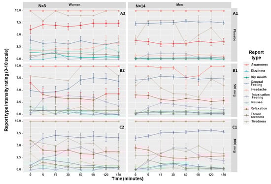 Our secondary analysis of the two PK studies found no significant differences between women and men in most of the common MC AEs or positively perceived effects (e.g., dizziness, tiredness, awareness or relaxation) at any time point (p > 0.05) (Figure 6).