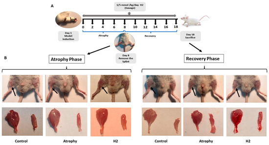 Schematic representation of the timeline of the experimental protocol (A). Macroscopic images of the hind limb and gastrocnemius-soleus muscles (indicated by black arrows) at the end of the atrophy phase (B-Left) and recovery period (B-Right).