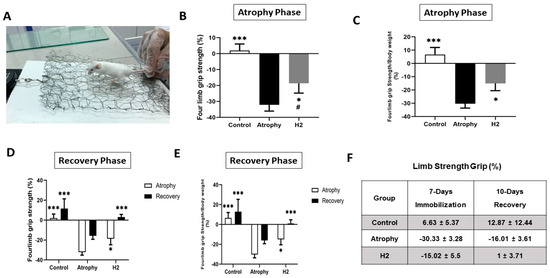 For measurement of grip strength, the animals grasped a mesh and the mouse’s tail was pulled directly toward the force meter until the hind limbs were released from the mesh assembly (A). Four limb strength and normalized strength in atrophy phase (B,C) and recovery phase (D,E). (F): percent of limb grip strength after 7-day immobilization and 10-day immobilization. Data were presented as mean ± standard error (Mean ± SE). (*** p < 0.001, * p < 0.05 compared to the atrophy group. # p < 0.05 compared to the control group); n = 6 for each group.