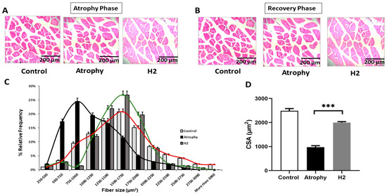 Representative image of H&E-stained sections of gastrocnemius muscles at the end of atrophy (A) and recovery phase (B) (×100). Quantitative assessment of muscle fiber size (C) and mean cross-section area of each muscle fiber at the end of the atrophy phase; Black: Atrophy; Green: Control; Red: H2 group (D). Cross-sectional area was measured and calculated from 150 skeletal muscle fibers in H&E-stained sections using Image J software (Version: 1.53t). (*** p < 0.01 compared to the atrophy group); n = 6 for each group.