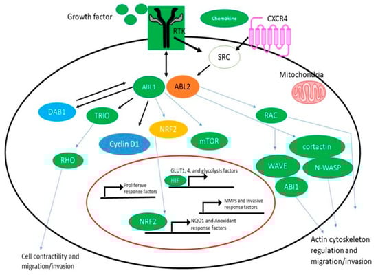 ABL Kinase Activation and Signaling in Solid Tumors. ABL kinases are activated by hyperactive receptor tyrosine kinases (RTKs), chemokine receptors, and SRC family kinases as well as by oxidative and metabolic stress. By activating multiple MMPs and actin-regulatory proteins such as RAC, cortactin, N-WASP, ABL interactor 1 (ABI1), and WAVE, activated ABL kinases promote cancer cell migration and invasion. ABL1 regulates cyclin D1 signaling downstream of the EPHB2 receptor to promote the activation of proliferative response factors in the intestinal epithelium and adenomas. In response to high fumarate levels, the ABL1 kinase becomes hyperactive in FH-deficient renal cancer cells (HLRCC); activated ABL1 promotes aerobic glycolysis via the mTOR-HIF1/pathway and also induces nuclear localization of the transcription factor NRF2 to induce the expression of NQO1 and other antioxidant response factors in HLRCC. NOTCH activation in the Apc+/D716 polyposis mouse intestinal epithelium promoted RBPJ-mediated transcription, leading to increased levels of DAB1, a substrate and activator of ABL kinases; activated ABL in colorectal cancer cells induced the tyrosine phosphorylation of TRIO on Y2681, leading to increased TRIO Rho-GEF activity.