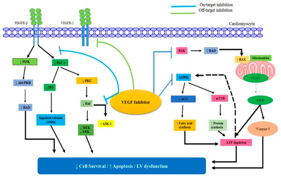The VEGF inhibitors’ mechanisms of direct myocardial damage. The pro-apoptotic factor BAD may become active in response to the inhibition of ribosomal S6 kinase (RSK). As a result, BAX is activated, and the mitochondria release Cyt C.