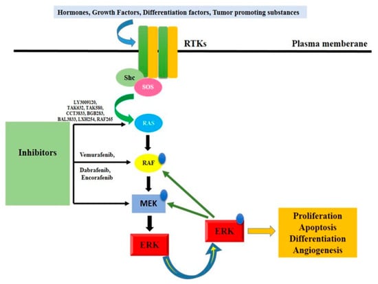 There is conclusive evidence that the RAS signaling cascade contributes to tumor growth. Point mutations in any of the cascade proteins are associated with either tumorigenesis (in the case of RAS and RAF mutations) or a poor prognosis (in the case of MEK and ERK mutations). It is worth noting that antagonistic driver mutations exist at every stage of the process [72]. This section discusses the mutation hotspots for each part of the signaling cascade. Ras/RAF/MEK/ERK signaling cascades (Figure 4) involve RAF as a critical direct effector of oncogenic Ras mutants and as a prominent target of oncogenic alterations. RAF, the first kinase in this pathway, has been studied extensively because of its potential as a drug target for cancer treatment. Vemurafenib, dabrafenib, and encorafenib, first-generation RAF inhibitors, were developed and utilized as monotherapies or in conjunction with MEK inhibitors to treat cancers harboring the BRAF (V600E) mutation [73]. These drugs had promising early results in treatment, but their effectiveness quickly waned as drug resistance spread. Cancer cells reactivate this pathway in response to drug treatment in two distinct ways, as revealed by mechanistic studies: (1) increasing the amount of active Ras in the cell, which results in paradoxical activation of ERK signaling, and (2) alternatively splicing BRAF (V600E) to produce variants with a truncated N-terminus, which enhances BRAF (V600E) homodimerization and reduces drug affinity. It is interesting to note that RAF inhibitors become addictive to drug-resistant cancer cells, and that discontinuing treatment with these drugs delays the evolution of resistant malignancies [72]. This can be explained by the concept of a “sweet spot” for hyperactive Ras/RAF/MEK/ERK signaling-driven cancer growth.