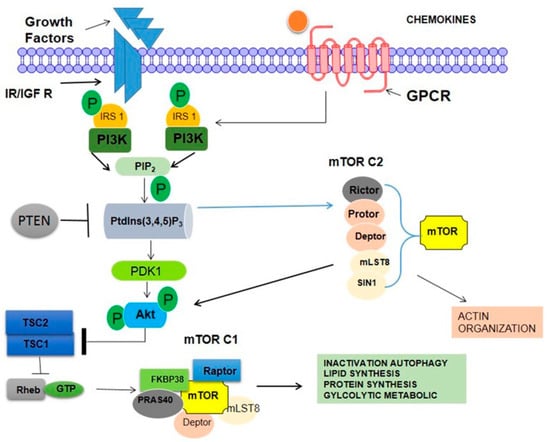 Mammalian target of rapamycin (mTOR) complexes (mTORCs) and the phosphoinositide 3-kinase (PI3K)/Akt signaling network. mTORC1 comprises regulatory-associated protein of mTOR (RAPTOR), proline-rich Akt substrate 40 kDa (PRAS40), mammalian lethal with Sec13 protein 8 (mLST8), and DEP domain-containing mTOR-interacting protein (DEPTOR), once TSC2 is phosphorylated by Akt, the GAP activity of the TSC1/TSC2 complex is repressed, allowing Rheb to accumulate in a GTP-bound state. As a consequence, Rheb–GTP upregulates the protein kinase activity of mTORC1. mTORC2 is involved in the spatial control of cell growth via cytoskeletal regulation.