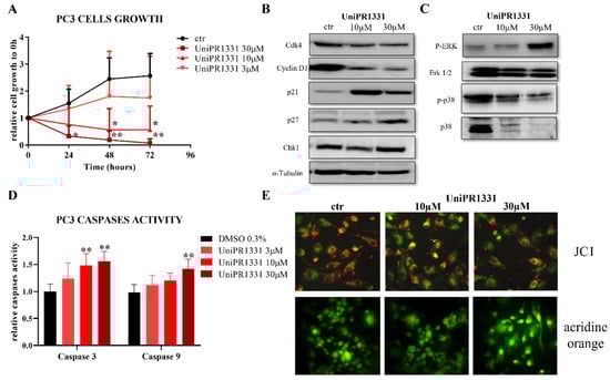 (A) Cell growth of PC3 cells treated with UniPR1331 at 30, 10, and 3 µM for 24, 48, and 72 h. Two-way ANOVA followed by Tukey’s post-test was used to compare all the groups to control group (DMSO 0.3%) at each time point, * p < 0.05 ** p < 0.01. (B) Western blot analysis of UniPR1331-treated PC3 cells for cyclin D1, CDK4, p21, p27, and chK1, as well as for ERK1/2/p-ERK and p38/p-p38 (C). (D) Enzymatic detection of caspases activity 3 and 9 in UniPR1331-treated PC3 cells. For both the caspases, one-way ANOVA followed by Dunnett’s post-test was used to compare all the groups to control group (DMSO 0.3%), ** p < 0.01. (E) JC1 (apoptosis index) and acridine orange (autophagy index) staining of UniPR1331-treated PC3 cells.