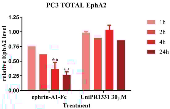 The EphA2 levels of PC3 cells stimulated with ephrin-A1-Fc 0.25 µg/mL or treated with UniPR1331 30 µM are relative to untreated PC3 cells. For both the treatments, one-way ANOVA followed by Dunnett’s post-test were used to compare all the groups to untreated group, ** p < 0.01.